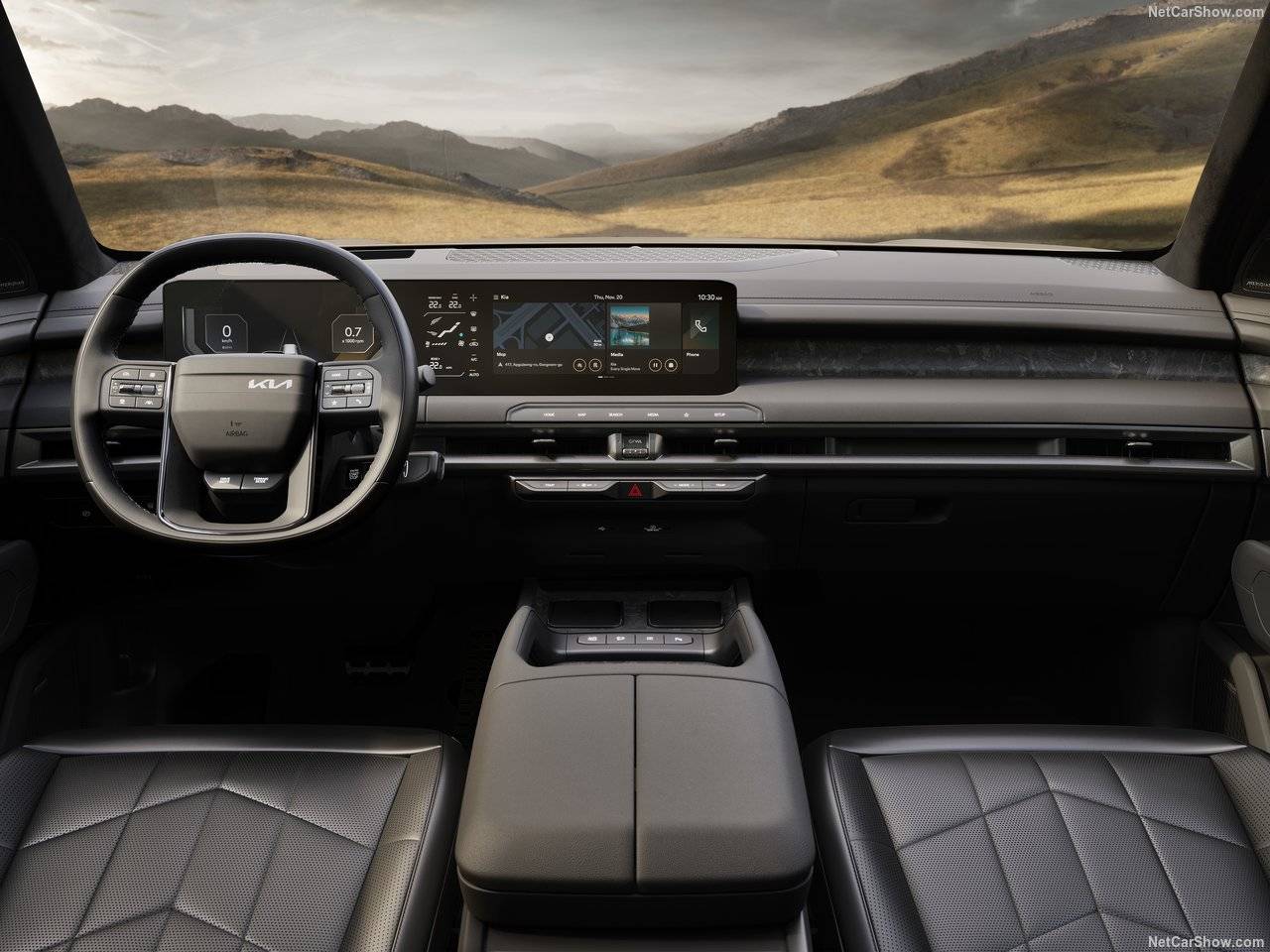 車內,環繞式內飾以寬闊的平臺帶來空間感,木質紋理飾板和金屬材質點綴,讓起亞也有豪華細節。方向盤不對稱的Logo和扶手前的拉手,都是全新Telluride的創意,大面積連屏則集成了行車、空調和娛樂信息。目前已知,起亞會提供更舒適的頭枕和后排小桌板,后備箱則可以用隔板進行分割。此外,新車還優化了第三排進出通道的寬度,車內頭部空間也有13mm提高。